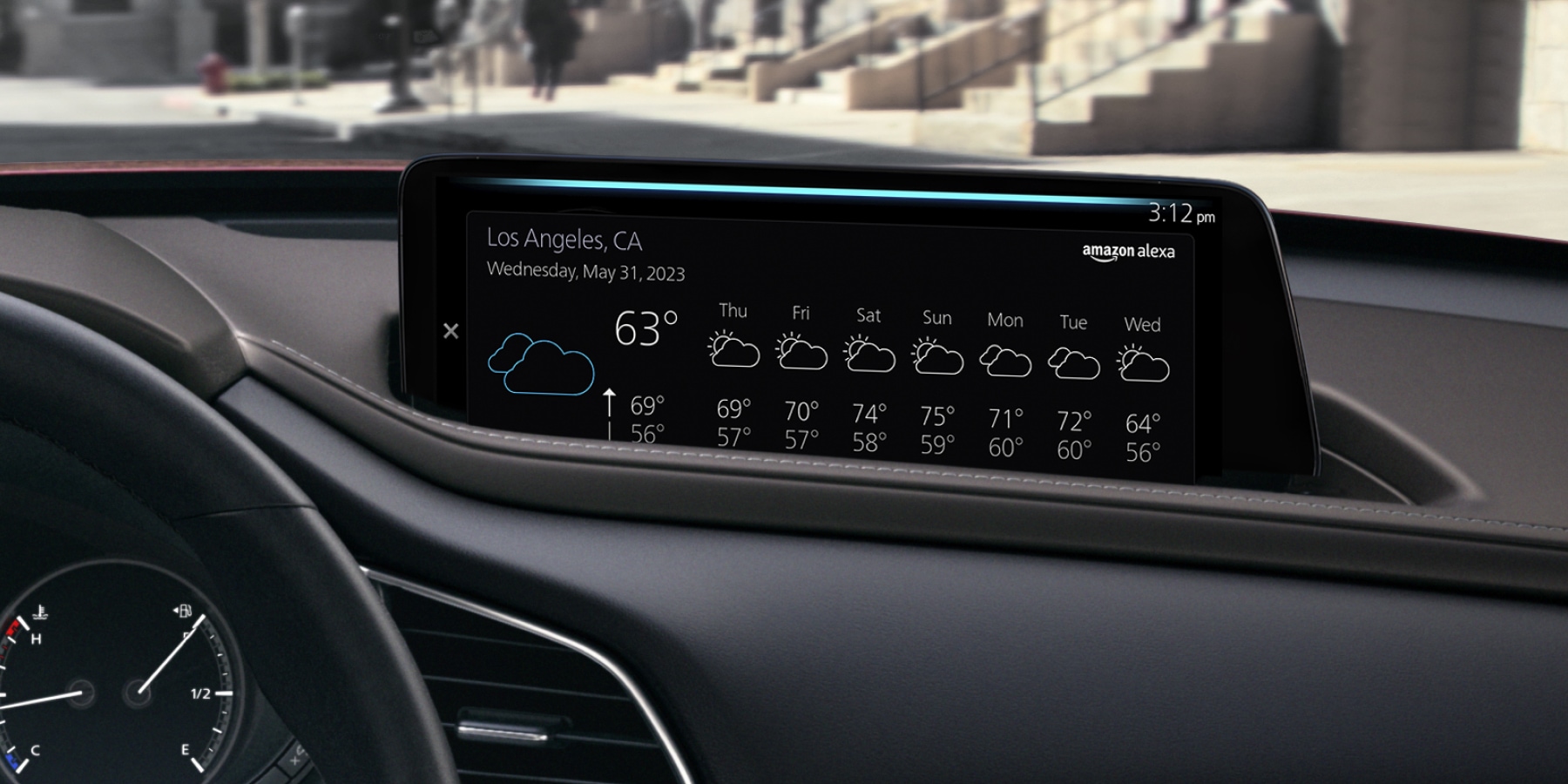 11 Don’t drive while distracted. Some features may require cellular or Wi-Fi service; some features may be locked out while the vehicle is in motion. For Alexa to work in your Mazda vehicle, you must first enroll in Mazda Connected Services (MCS) OR tether to a mobile Wi-Fi hotspot. Music cannot be played via Alexa if only paired via MCS. Not all features are compatible with all phones. Message and data rates may apply. Amazon, Alexa and all related logos are trademarks of Amazon.com, Inc. or its affiliates.